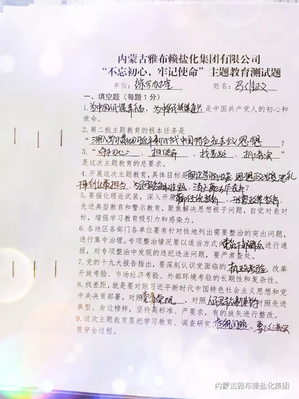为扎实深入推进“不忘初心,牢记使命”主题教育,进一步夯实政治基础、思想基础,提高党员的政治意识和综合素质。近日,内蒙古雅盐化集团公司党委在全体在职党员中开展了主题教育应知应会测试答题活动。